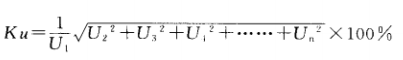 (9> 線電壓波形正弦性畸變率。指線電壓基波以外的各次諧波電壓平方和的均方根值與 基波電壓比值的百分?jǐn)?shù),用Ku表示。電壓波形畸變率小,意味著輸出的電壓質(zhì)量好。其計(jì) 算公式為: