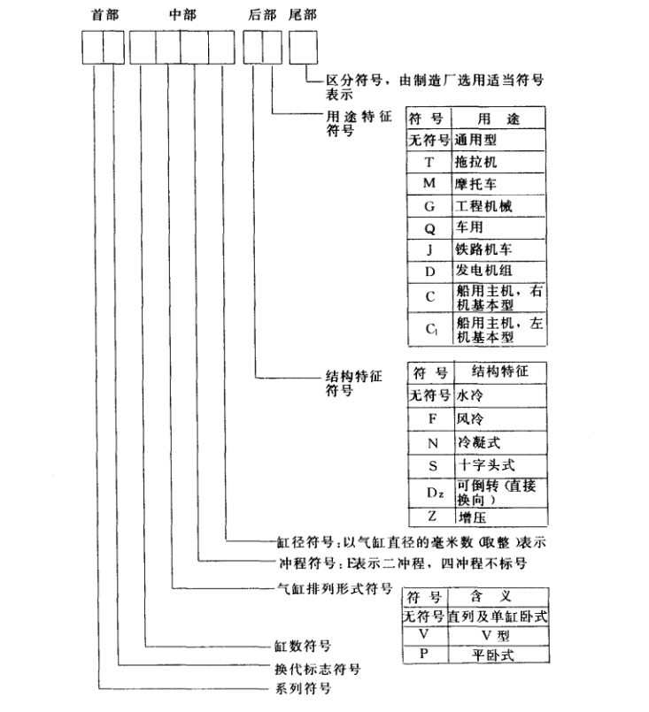 柴油機(jī)、汽油機(jī)統(tǒng)稱內(nèi)燃機(jī),其型號由首部、中部、后部、尾部四部分組成: