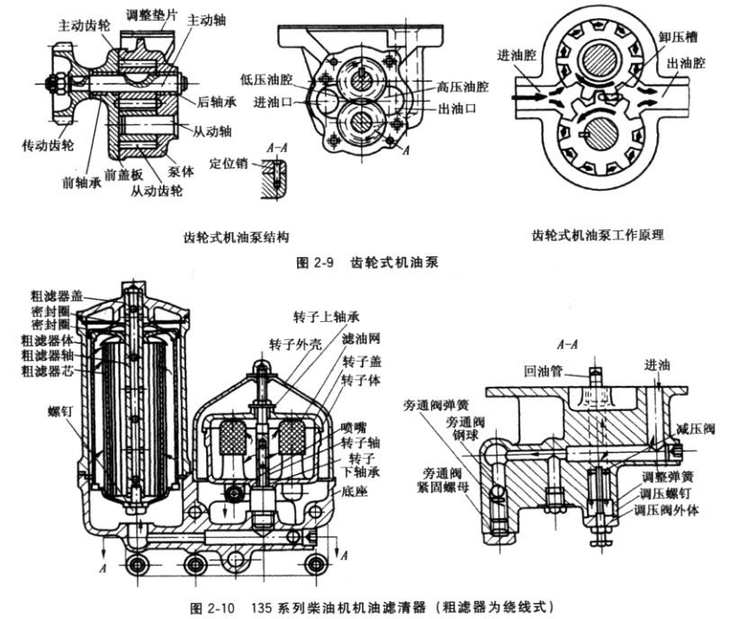 潤滑系統(tǒng)包括機油冷卻器、機油泵、機油濾清器等,見圖2-8?圖2-10。它起潤滑、冷卻、凈化、密封、防銹等作用。常見 的潤滑方式有飛濺式、壓力式、復合 式3種。為了使內(nèi)燃機可靠地工作并 延長使用壽命,通常都采用復合式 潤滑。
