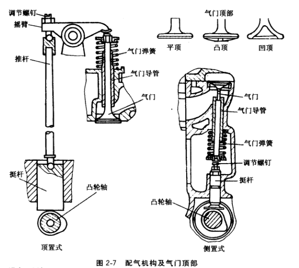 內(nèi)燃機配氣機構(gòu)包括進氣門、排氣門、搖臂、推桿、挺桿、凸輪軸等(見圖2-7), 是實現(xiàn)內(nèi)燃機進氣過程和排氣過程的控制機構(gòu)。它的作用是按照所進行的工作過程,定時地開 啟和關(guān)閉進,排氣門,使新鮮空氣或可燃混合氣進人氣缸,并把燃燒后的廢氣從氣缸內(nèi)排 出。配氣機構(gòu)常見的有兩種形式:一是氣門式(分為頂置式與側(cè)置式),它由凸輪驅(qū)動氣門 來控制進、排氣過程,四沖程內(nèi)燃機都采用氣門式配氣機構(gòu);一是氣孔式,它是在氣缸套中間開有進、排氣孔,通過活塞位移來控制進、排氣過程,這是二沖程內(nèi)燃機(主要是汽油機)常用的一種配氣機構(gòu)。