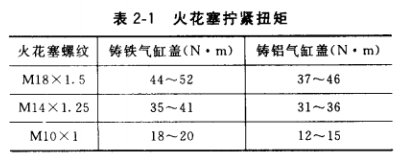 火花塞損壞后一般要換新品。新火花塞旋進(jìn)火花寒孔時,應(yīng)按規(guī)定扭矩擰緊(見表2-1)。 擰得太緊絕緣體可能破裂、損壞,擰得太松氣缸不密封引起漏氣。