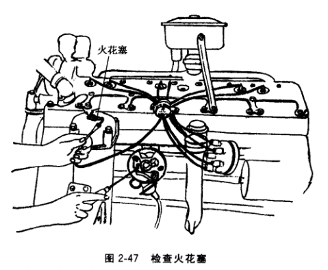 再用汽油洗凈,如積炭過多不易清理 時,可用火烤一下,將電極間的積炭烤焦(溫度不可過高,以免損壞絕緣體)后清理。在檢査其絕緣體是否擊穿時,可將清理完的火花塞放在氣缸蓋上,將分電器蓋打開,拔下蓋上的中央高壓線,使之與火花塞鐵心接線處接觸,做跳火檢査,如圖2-47所 示,査看火花塞電極間的跳火情況。