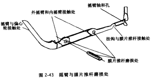 (3) 搖臂的維修。汽油泵搖臂與凸輪接觸處或搖臂與膜片推桿聯(lián)動處磨損嚴(yán)重(見圖 2-43),使膜片行程減小,影響泵油量,汽油機(jī)在高速運(yùn)轉(zhuǎn)或全負(fù)荷時,會感到汽油供應(yīng)不足。磨損嚴(yán)重的可堆焊,然后用銼刀修整。也可應(yīng)急修理,即在汽油泵和缸體連接處拆下適當(dāng)?shù)膲|片臨時使用; 還可在搖臂與膜片推桿掛鉤支撐處,根據(jù)泵油量墊上適當(dāng)?shù)蔫F絲或開口銷,但注意要纏好、鎖住,以防掉下來。 不管堆焊還是加裝墊物,都要注意保持一定的間隙,不能卡死,以免裝在氣缸體上后,損壞機(jī)件或不泵油,