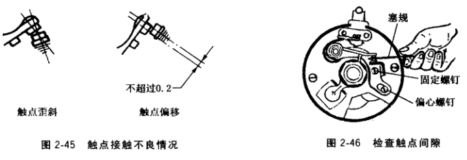 觸點(diǎn)修整后或換用新件裝復(fù)時,上下觸點(diǎn)面的中心線不可歪斜,中心線偏移不得超過 0.2mm,如圖2-45所示。否則因接觸面過小而易燒蝕?;顒佑|點(diǎn)臂的膠木襯套和頂塊如磨損或損壞,應(yīng)換新件。裝復(fù)時,膠木襯套也應(yīng)點(diǎn)機(jī)油潤滑。觸點(diǎn)臂的彈簧張力不足,可彎曲 彈簧片加以調(diào)整。
