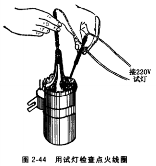 汽油機(jī)在運(yùn)行中,可根據(jù)點(diǎn)火線圈的溫度來判斷其是否損壞:微熱為良好,燙手說明此線圈己損壞??蓪岩蓳p壞的點(diǎn)火線圈裝在點(diǎn)火系統(tǒng)完好的汽油機(jī)上進(jìn)行高壓火花檢査,以判斷其是否損壞。用試燈(用220V交流電做電源)檢査點(diǎn)火線圈是常用的方法。
