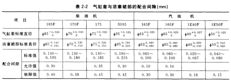 與活塞的配合間隙,此間隙在修理前后必須進(jìn)行檢測。沒有量具時,可用塞規(guī)結(jié)合實(shí)際經(jīng)驗(yàn)進(jìn)行測量。把活塞倒置在氣缸套內(nèi),活塞裙部處于氣缸套中部位置,把適當(dāng)厚度的塞規(guī)放在活塞裙部承壓面與氣缸壁之間,然后抽出塞規(guī),如感到有一定阻力,但又能順利抽出,則該塞規(guī)的厚度即為氣缸套與活塞的配合間隙。幾種小型柴油機(jī)、汽油機(jī)活塞與氣缸套的配合間 隙見表2-2。
