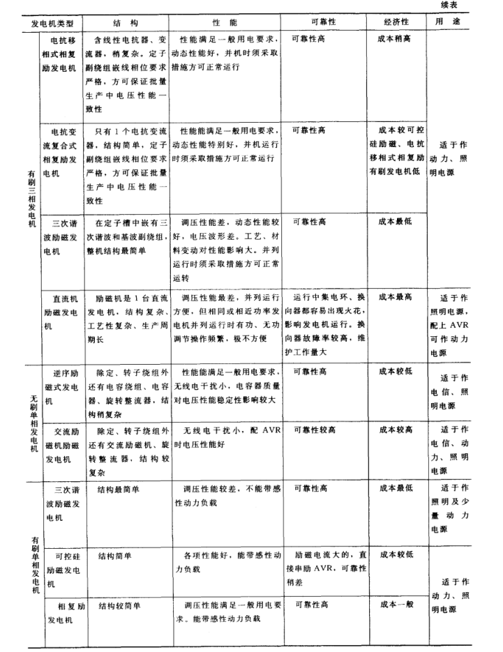 各類發(fā)電機的結構、基本性能、可靠性、經(jīng)濟性、用途見表3-2。