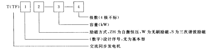 與內(nèi)燃機配套的交流發(fā)電機目前沒有統(tǒng)一的型號編制,常用的型號編制有以下兩種: