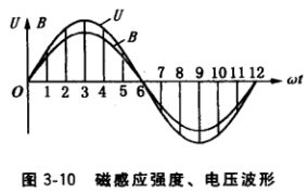 (2) 交流電的產(chǎn)生。交流電指的是大小和方向隨時(shí)間按正弦規(guī)律作周期性變化的電流或電壓。圖3-9所示發(fā)電機(jī)轉(zhuǎn)子順時(shí)針方向旋轉(zhuǎn),當(dāng)磁極①、②這一對(duì)N、S極掠過定子繞組U1的導(dǎo)線時(shí),該繞組導(dǎo)線感應(yīng)的電壓為:磁極①極性為N,當(dāng)極弧表面上的點(diǎn)1、2、3三 個(gè)位置先后掠過繞組U1時(shí),該繞組感應(yīng)電壓方向用右手定則判定為正;磁極②極性為S, 當(dāng)極弧表面上的點(diǎn)4、5、6三個(gè)位置先后掠過繞組U1時(shí),該繞組感應(yīng)電壓方向用右手定則判定為負(fù)。由于磁極鐵心極弧表面與定子鐵心之間的氣隙大小設(shè)計(jì)成不均勻,中央氣隙小, 兩側(cè)氣隙大,通過氣隙大小和極靴寬度的合理選取,使沿極弧表面各處的磁感應(yīng)強(qiáng)度按正弦曲線分布。當(dāng)磁極的不同點(diǎn)掠過繞組U1時(shí),該繞組感應(yīng)的電壓大小也按正弦曲線分布,如圖3-10所示,這就是單相交流電。交流發(fā)電機(jī)的轉(zhuǎn)速、磁極對(duì)數(shù)和感應(yīng)的 交流電頻率之間的關(guān)系式為:?=Pn/60 (式中?為交流電頻率,n為轉(zhuǎn)速,P為極對(duì)數(shù))。在圖3-9中一個(gè)N極和一個(gè)S極組成1個(gè)極對(duì)數(shù),該發(fā)電機(jī)為4極,即2 對(duì)極。