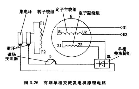 有刷單相交流發(fā)電機(jī)原理電路如圖3-26所示。由勵(lì)磁電源輸出的直流電(勵(lì)磁電源一 般來自定子副繞組感應(yīng)的交流電經(jīng)整流成的直流電)向轉(zhuǎn)子磁極繞組提供勵(lì)磁電流。發(fā)電機(jī)由內(nèi)燃機(jī)驅(qū)動(dòng)至空載轉(zhuǎn)速,依靠轉(zhuǎn)子磁極鐵心的剩磁磁場(chǎng)(新機(jī)或經(jīng)大修的舊機(jī)須經(jīng)充磁后,磁極鐵心才有剩磁磁場(chǎng)),在定子繞組中感應(yīng)出交流電,由于定子梢中嵌人的繞組是單相繞組,因而感應(yīng)的是單相交流電壓。調(diào)節(jié)磁場(chǎng)變阻器或自動(dòng)電壓調(diào)節(jié)裝置的電位器,可使發(fā)電機(jī)空載電壓整定在額定電壓值。