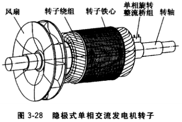 (2) 轉子。包括風扇、轉子鐵心、轉子繞組、單相旋轉整流橋組、軸承。轉子外形如圖 3-28所示。其風扇、軸承與有刷單相交流發(fā)電機基本一樣,這里不作介紹。