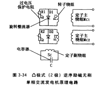 凸極式逆序勵(lì)磁無刷單相交流發(fā)電機(jī)整機(jī)原理電路如圖3-34所示。發(fā)電機(jī)由內(nèi)燃機(jī)驅(qū)動(dòng)至空載轉(zhuǎn)速,依靠轉(zhuǎn)子鐵心的剩磁磁場(chǎng),定子副繞組Sc感應(yīng)電壓,流過的容性電流產(chǎn)生單相脈動(dòng)磁場(chǎng)。它可分解為順序和逆序兩個(gè)旋轉(zhuǎn)磁場(chǎng),逆序磁場(chǎng)的旋轉(zhuǎn)速度與轉(zhuǎn)子轉(zhuǎn)速相等,但方向相反,在轉(zhuǎn)子繞組上感應(yīng)出2倍發(fā)電機(jī)額定頻率的交流電流,經(jīng)整流后向轉(zhuǎn)子繞組提供直流電流(勵(lì)磁電流〉,建立轉(zhuǎn)子主磁場(chǎng);順序磁場(chǎng)旋轉(zhuǎn)速度與轉(zhuǎn)子轉(zhuǎn)速相等,且方向相同,對(duì)轉(zhuǎn)子主磁場(chǎng)起助磁作用。由于定子副繞組流過的是容性電流,容性電流的磁場(chǎng)對(duì) 轉(zhuǎn)子主磁場(chǎng)也起助磁作用。逆、順序磁場(chǎng)共同 作用,在定子主繞組上感應(yīng)出空載電壓,實(shí)現(xiàn) 發(fā)電機(jī)自勵(lì)建壓。只要定、轉(zhuǎn)子各繞組參數(shù)設(shè) 計(jì)合理,在空載轉(zhuǎn)速下,定子主繞組感應(yīng)的電 壓便可達(dá)額定值。定子主繞組Mc1,和Mc2串聯(lián) 時(shí)發(fā)電機(jī)輸出230V電壓,并聯(lián)時(shí)輸出115V 電壓。發(fā)電機(jī)負(fù)載時(shí),其工作原理與隱極式逆 序勵(lì)磁單相交流發(fā)動(dòng)機(jī)基本相同。