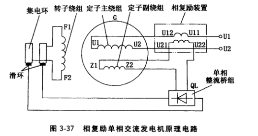 相復勵單相發(fā)電機原理電路 如圖3-37所示。發(fā)電機由發(fā)動機驅動至額定轉速附近時,依靠轉子鐵心剩磁磁場,定子副繞組感應的電壓經電抗變流器二次繞組的移相作用,提供建立發(fā)電機空載電壓的交流勵磁電流的電壓分量,經單相整流橋組整流后,向發(fā)電機轉子繞組提供空載勵磁電流,發(fā)電機很快自勵建立空載電壓。