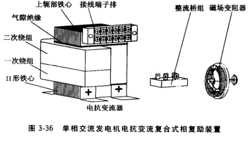 (2) 相復勵裝置。其外形、結構如圖3-36所示,它包括電抗變流器、單相整流橋組和磁場變阻器。作為可控相復勵裝置,還必須外配分流式自動電壓調節(jié)器。