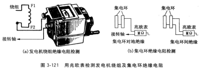 兆歐表的2個接線柱經(jīng)絕緣導(dǎo)線分別與集電環(huán)的2個銅環(huán)相接,見圖3-121b (右),手搖兆歐表手把,即測得2個銅環(huán)間的絕緣電阻。
