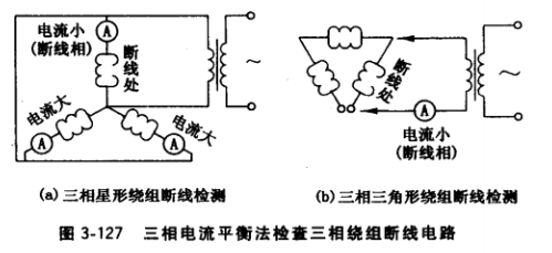 (1)三相電流平衡法。對(duì)于星形接法的三相繞組,將其三相線端并聯(lián),通入低壓大電流 (一般為銘牌額定電流的1/3),如圖3-127a所示,電源一般用單相交流弧焊機(jī)。對(duì)于三角形接法的三相繞組,應(yīng)拆開任意兩 相之間的一個(gè)接點(diǎn),見圖3-127b。當(dāng)電流表指示的三相電流值相差 大于5%時(shí),電流小的一相為斷 線相。