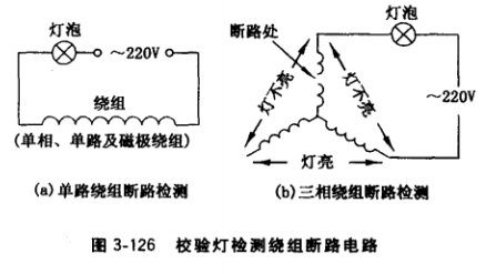通以市電,燈亮繞組無斷路,燈不亮被測(cè)繞組不通,則為斷路。圖3-126a 為單路、單相及磁極繞組檢測(cè)電路,圖3-126b為三相星形接法繞組檢測(cè)電路。