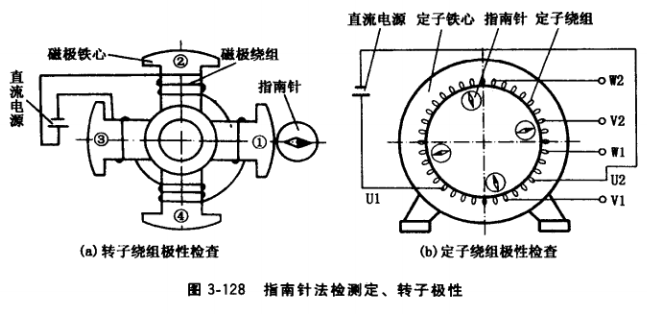(1)檢査轉(zhuǎn)子極性。把轉(zhuǎn)子垂直落地,接線見圖3-128a。繞組中通直流電后,把指南針靠近磁極鐵心,并緩緩移動(dòng)一圈。若繞組接線正確,則指南針從①→④極靠近鐵心時(shí),磁針轉(zhuǎn)向鐵心的順序是白、黑、白、黑(或黑、白、黑、白〉,否則即可判斷繞組接線錯(cuò)誤。