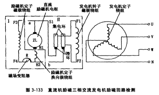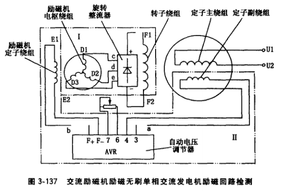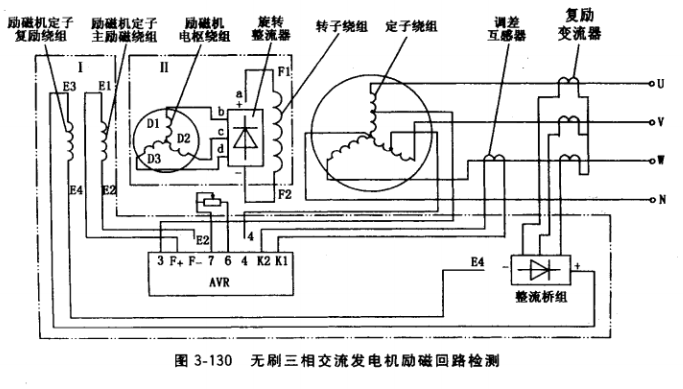 圖3-129中雙點(diǎn)劃線框內(nèi)部分為這種發(fā)電機(jī)勵磁回路,它包括U相定子繞組、AVR (或整流橋組)、集電環(huán)、轉(zhuǎn)子繞組F1F2及各段連接線。