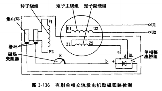 圖3-136雙點(diǎn)劃線框內(nèi)的部分是這種發(fā)電機(jī)勵磁回路,包含定子副繞組Z1Z2、單相整流橋組QL、磁場變阻器R、集電環(huán)、轉(zhuǎn)子繞組F1F2及各段連接線。檢測前先拆開單相整流橋組交、直流側(cè)各一個(gè)接點(diǎn),然后按以下順序檢測: