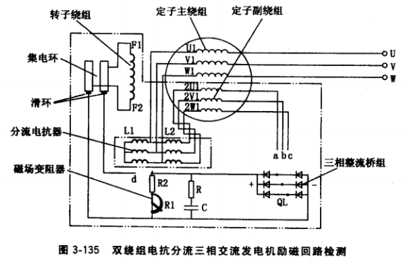 圖3-135雙點(diǎn)劃線框內(nèi)部分是這種發(fā)電機(jī)勵磁回路,包含三相電抗器、定子三相副繞組、三相整流橋組、轉(zhuǎn)子繞組、集電環(huán)、磁場變阻器、分流變阻器及各段連接線。檢測前先拆開定子三相副繞組與三相整流橋組交流側(cè)的連接,集電環(huán)與磁場變阻器的一端連接。然后 按如下順序檢測: