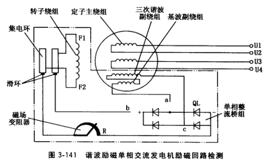 圖3-141雙點(diǎn)劃線框內(nèi)部分為這種發(fā)電機(jī)勵磁回路,包含定子三次諧波副繞組、定子基波副繞組、單相整流橋組、磁場變阻器、集電環(huán)、轉(zhuǎn)子繞組及各段連接線。檢測前先拆開單相整流橋組交、直流側(cè)各一個(gè)接點(diǎn),然后按以下順序檢測: