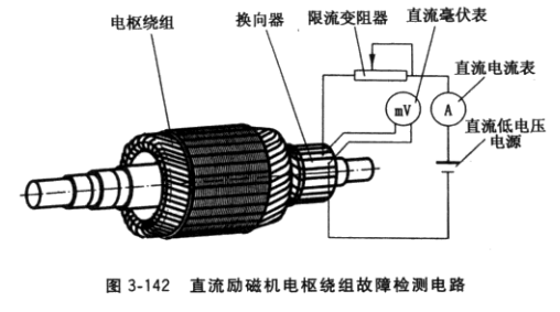 ①電樞繞組短路。用毫伏表測(cè)量每相鄰兩片片間電壓,當(dāng)出現(xiàn)兩處,例如14、15片間 和30、31片間電壓讀數(shù)很小,根據(jù)圖3-143b即可斷定15與30片間電樞繞組短路。