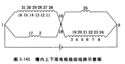 ③由于直流電壓是加在換向片1和9,根據(jù)圖3-143b可知16、17對(duì)1是等電位點(diǎn),24、 25對(duì)9也是等電位點(diǎn),用毫伏表測(cè)量相鄰片16、17及24、25片間電壓等于零或極小,不可誤認(rèn)為短路。為了進(jìn)一步判斷該兩處是否有短路,可分別測(cè)量1、16, 1、17, 24、9, 25、9片間電壓,讀數(shù)為零或極小者為短路。