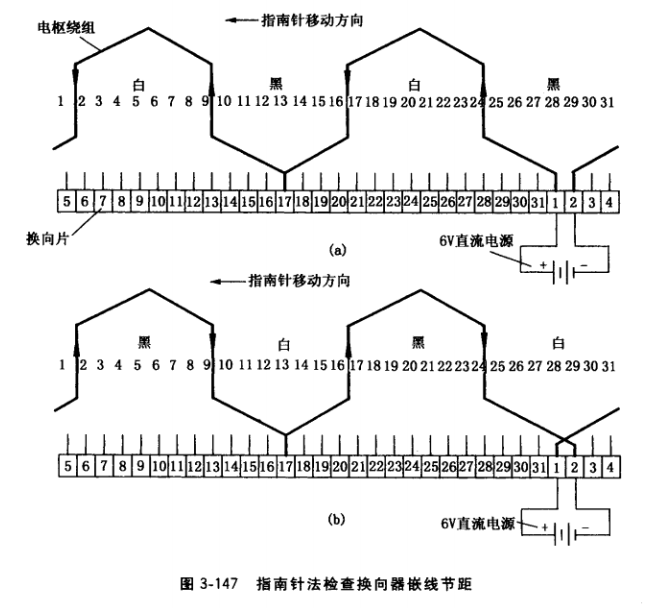 ②用指南針沿通電的繞組依次移動(dòng),觀察 指南針指向是否異常,可以判斷嵌線錯(cuò)誤。圖 3-147以換向片1、2所連接的電樞繞組為例,檢測(cè)時(shí)把電樞垂直放S臺(tái)面。圖a為IH確嵌線,在換向片1、2施加6V直流電壓,正極接片1,負(fù)極接片2,此時(shí)繞組電流方向如箭頭 所示,把指南針靠近電樞表面順時(shí)針移動(dòng)一周,磁針指向先后順序?yàn)楹?、白、黑、白。依?方法,逐個(gè)測(cè)試換向片2、3, 3、4……磁針指向均應(yīng)黑、白、黑、白。圖b中與換向片1、 2連接的電樞繞組引線嵌錯(cuò),這時(shí)電樞繞組中電流方向與圖a相反,則指南針順時(shí)針移動(dòng)一 周時(shí),磁針指向與圖a相反。說明檢測(cè)過程中,磁針指向規(guī)律突然變反,可斷定該處繞組在 換向片上嵌反。