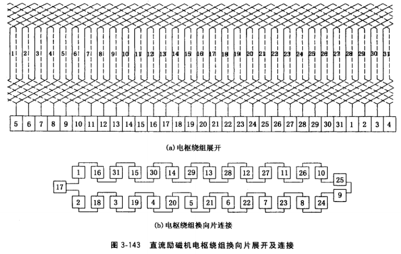 (1) 選定直流低壓電兩端接于換向片的片序號(hào)(應(yīng)使該兩片內(nèi)形成的兩支路電樞繞組數(shù) 相等或基本相等,如本例31槽共31個(gè)繞組,一支路15個(gè)繞組,另一支路16個(gè)繞組)。