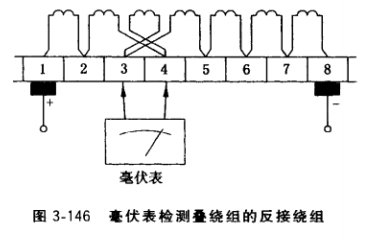 ①在被測(cè)支路兩端換向片施加低壓直流電 源(一般為6V),用毫伏表依次測(cè)量換向器片 (如片3、4)間電壓,如圖3-146所示,有倒讀 數(shù)(表針反轉(zhuǎn)〉出現(xiàn),片2、3之間以及片4、5 之間讀數(shù)加倍,其他各處均正常,則斷定接到 換向片3、4的繞組接反。