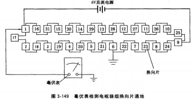 (1)電樞繞組與換向器連接一體情況下?lián)Q向器通 地,可用毫伏表法檢測(cè)。6V直流電源加于換向片1、9,毫伏表一端接地,另一端由片1或9開(kāi)始逐片測(cè)量對(duì)地電壓,如圖3-149所示,若換向器某處通地,由于越接近接地點(diǎn),換向片對(duì)地電壓越低,當(dāng)毫伏表指示的電壓接近零時(shí),該換向片疑為通地。再繼續(xù)測(cè)量以下各片對(duì)地電壓,若毫伏表讀數(shù)又逐片大起來(lái),則可斷定對(duì)地電壓接近零的換向片及其所連接的電樞繞組通地。此時(shí)必須脫開(kāi)電樞繞組與該片連接,若測(cè)得該片對(duì)地電壓仍為最小或接近零,可斷定該換向片通地。