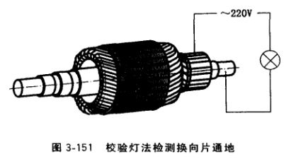 ②校驗(yàn)燈法。用220V交流電經(jīng)1個(gè)燈泡接于轉(zhuǎn)軸,如圖3-151所示,按順序逐片檢測(cè), 若燈泡發(fā)亮,說(shuō)明該換向片通地。