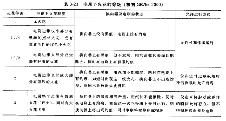 直流勵(lì)磁機(jī)運(yùn)行中換向器與電刷滑動(dòng)接觸面處的火花,可按表3-23的規(guī)定鑒別火花等級(jí),并確定其能否繼續(xù)工作。