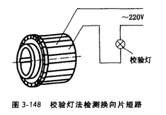 ②校驗(yàn)燈法。用220V交流電經(jīng)1個(gè)燈泡,如圖 3-148所示,按順序逐個(gè)檢測(cè)相鄰兩片換向片,若燈泡發(fā) 亮,說(shuō)明該兩片換向片片間短路。