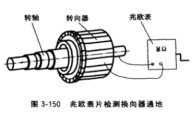 ①兆歐表法。如圖3-150所示,兆歐表兩接線端分別接觸轉(zhuǎn)軸和換向片,由慢到快搖動(dòng)兆歐表手把,逐片測(cè)量換向片對(duì)轉(zhuǎn)軸絕緣電阻,若絕緣電阻為零,可斷定該片通地。