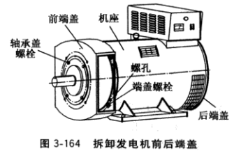 拆卸程序:從機組卸下發(fā)電機→拔出彈性聯(lián)軸器(必要時)→拆勵磁裝置及小成套控制箱→從刷握取出電刷(僅對有刷發(fā)電機)→拆前軸承蓋→拆前端蓋→拆后端蓋→從后端蓋拆下勵磁機定子→吊出轉(zhuǎn)子→拆前、后軸承→拆風(fēng)扇→拆旋轉(zhuǎn)整流器→拆勵磁機電樞。