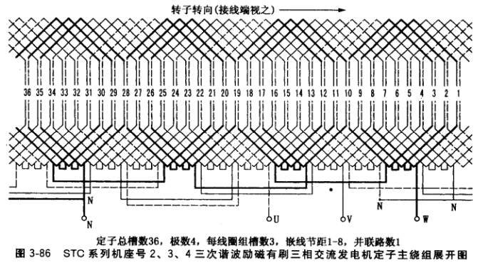 另一種諧波副繞組是單相單層疊式繞組,如圖3-198所示為其繞組展開圖。該繞組嵌線節(jié)距為y=l-3,其嵌線順序?yàn)椋喊丫€圈組第1個(gè)線圈的線圈邊1嵌入1號(hào)槽,把線圈邊2嵌入3號(hào)槽,接著把該線圈組第2個(gè)線圈兩個(gè)線圈邊反把后分別嵌入4和6號(hào)梢,之后第3、 5……奇數(shù)號(hào)線圈嵌線方法與第1個(gè)線圈相同,第2、4……偶數(shù)號(hào)線圈嵌線方法與第2個(gè)線圈相同,直至全部嵌完。