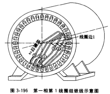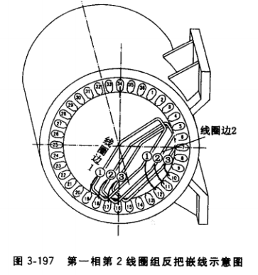 必須注意的是,一般每相線圈的第1線圈組和第2線圈組是連繞,甚至第1?第4線圈組都連繞,對(duì)此,每嵌到每相第2、第4線圈組時(shí) (即順序?yàn)殡p)應(yīng)反把嵌線,其方法是:嵌每相第2、第4線圈組時(shí),把線圈邊1和線圈邊2對(duì)調(diào)嵌入槽中。以該發(fā)電機(jī)繞組為例,嵌第一相 第2線圈組時(shí),線圈邊1應(yīng)嵌入17、18、19號(hào) 槽,線圈邊2則嵌在10、11、12號(hào)槽(見圖 3-197)。以此類推,每嵌到雙序號(hào)線圈組均按此 方法嵌線。