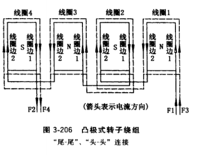 (1)發(fā)電機的極數(shù)和極性。各類發(fā)電機銘牌上都明確規(guī)定該發(fā)電機的極數(shù),如銘牌產(chǎn)品型號是TZH-75-4,其中的4就表示該發(fā)電機為4極。這個極數(shù)必須通過極性體現(xiàn)出來,也就是說不論轉(zhuǎn)子還是定子必須有N、S、N、S ,4個極性,要獲得這樣4個極性繞組就必須正確連接。圖3-204是一套繞組,該繞組由線圈1到線圈4串聯(lián)而成,當給繞組通入圖示箭頭方向直流電時,根據(jù)右手螺旋定則,線圈1產(chǎn)生的磁場方向為離開紙面出來,設(shè)定其極性用 “N”表示,線圈2產(chǎn)生的磁場極性方向為朝向紙面,其極性用“S”表示。同樣,線圈3產(chǎn)生的磁場極性為“N”,線圈4產(chǎn)生的磁場極性為“S”,這樣形成4個極性。注意,這套繞組的連接方法是線圈1的尾線和線圈2的尾線連接,線圈2的頭線和線圈3的頭線連接,線圈3的尾線和線圈4的尾線連接。這個接法俗稱為“尾-尾”連、“頭-頭”連接。