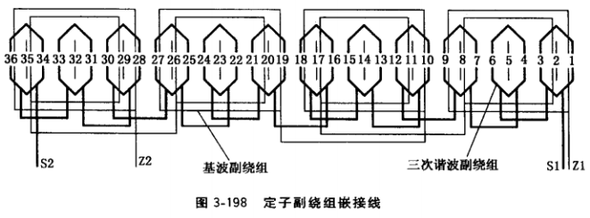 (3)定子副繞組接線。三相的,按圖3-198及其說明的方法,單相的按上述“單相交流發(fā)電機定子繞組嵌線”的方法,示例見圖3-102。