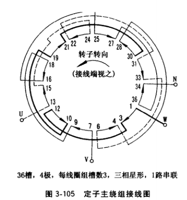 (1)定子三相主繞組接線。要獲得三相繞組的正確接線,必須符合4點要求:每一相繞組必須接成該發(fā)電機規(guī)定的極數(shù),且均布于定子圓周; 任意兩相繞組之間相位差應(yīng)等于 120°電角度;三相電壓U、V、W的相序應(yīng)符合順相序,按設(shè)計規(guī)定或銘牌規(guī)定接成三相繞組。以圖3-105所示36槽、4極、每線圈組槽數(shù)3、1路串聯(lián)、三相星形接法的定子主繞組接線為例,介紹接線方法。圖中,內(nèi)圈帶箭頭的12個弧線表示12個線圈組(4極發(fā)電機, 每相一般設(shè)計有4個線圈組,三相共有12個線圈組),箭頭方向表示每相4個線圈組要形成 4極極性N、S、N、S所必需的正確的電流方向,數(shù)碼編號表示槽號,中間的帶箭頭圓弧線 表示轉(zhuǎn)子旋轉(zhuǎn)方向(從定子繞組接線端視之)。接線順序:
