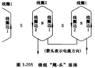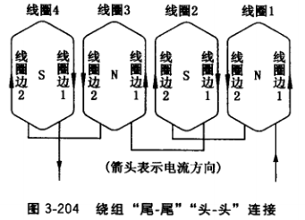 (1)按圖3-205介紹的“尾-頭”連接法把第一相3個線圈接成極性為N、S、N、S、 N、S的6個極的相繞組。