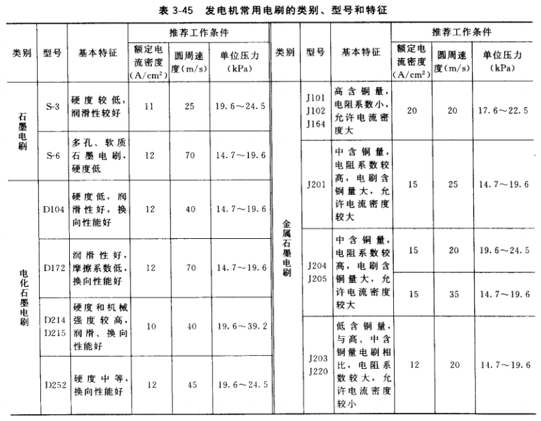 (1)正確選用電刷,包括電刷牌號(hào)、電刷截面(影響電刷電流密度)、電刷壓力等都必 須符合表3-45規(guī)定。