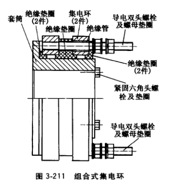 (2)更換集電環(huán)??烧?qǐng)發(fā)電機(jī)生產(chǎn)廠家提供同規(guī)格新集電環(huán),或就地加工組合式集電 環(huán),其結(jié)構(gòu)如圖3-211所示。圖中每個(gè)序號(hào)代表1個(gè)零件,根據(jù)集電環(huán)的總體尺寸,制作每個(gè)零件,并組裝成集電環(huán)。集電環(huán)中兩個(gè)滑環(huán)應(yīng)經(jīng)對(duì)地及環(huán)與環(huán)之間耐壓檢測(cè),合格后經(jīng)浸絕緣漆處理,裝上轉(zhuǎn)子,再經(jīng)車床加工外圓面后,方可投入使用。