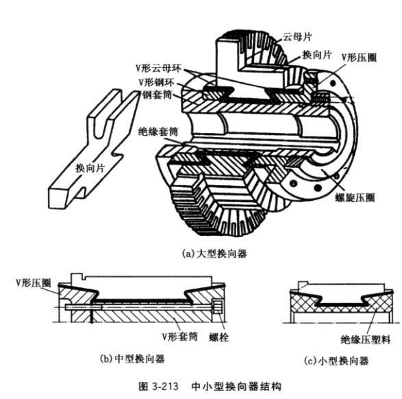 換向器結(jié)構(gòu)如圖3-213所示。圖a為大型換向器結(jié)構(gòu),用螺旋壓圈鎖緊。圖b為中型換向器結(jié)構(gòu),靠圓周均勻分布的3個(gè)軸向螺栓鎖緊。圖c為小型換向器結(jié)構(gòu),采用絕 緣壓塑料成型。