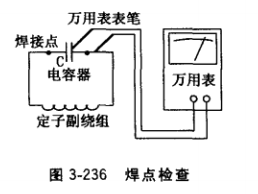 ①檢査定子副繞組與電容器間焊接是否良好。如圖3-236 所示,用萬用表R×1擋,一根表筆搭焊點一側(cè)的電容器引線片上,另一根表筆搭焊點另一側(cè)的導線上,若接點焊接良好,電阻應趨于0Ω,焊接不良便有一定電阻。若電容器由多個并聯(lián)焊接,還必須分別測量所有焊接點電阻,若焊接處脫焊、虛焊,則趨于大阻值,此時可用25W或45W電烙鐵重新焊過,直至萬用表指示趨于0Ω為止。