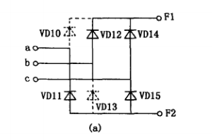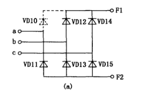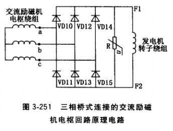 (2)原因分析。用于無刷發(fā)電機(jī)的交流勵(lì)磁機(jī)電樞繞組一般為三相星形接法,它與旋轉(zhuǎn)整流元件直接連接,整流方式有三相橋式和三相半波兩種,不管哪一種方式,只要有一個(gè)旋轉(zhuǎn)整流元件因過壓或過流損壞而短路,都將造成此故障?,F(xiàn)以圖3-251的三相橋式連接的交流 勵(lì)磁機(jī)電樞回路為例說明。若整流元件VD10 損壞,當(dāng)電樞繞組電壓Uab或Uac為最大值時(shí),三相整流橋可正常工作,而在其他情況下三相整流橋都不能正常工作。例如,Ubc為最大正值 時(shí)(即b點(diǎn)電位最高,a點(diǎn)電位最低,電流回路一定是b—VD12—VD10—a,而不可能是 b—VD12—F1—F2—VD11—a。這就造成兩種結(jié)果:其一,發(fā)電機(jī)轉(zhuǎn)子繞組F1F2得不到勵(lì)磁電流;其二,整流元件VD12將因電樞電壓Uba輸出回路b—VD12—VD10—a短路而過電 流,直至燒毀。同理,可分析其他時(shí)刻的整流情況??傊嗾鳂騐D10?VD15中某個(gè)硅元件損壞,必然使轉(zhuǎn)子繞組F1F2的平均電流減小,從而使發(fā)電機(jī)端電壓下降,并有可能擴(kuò)大故障,使其余整流件相繼損壞,導(dǎo)致勵(lì)磁機(jī)電樞繞組因持續(xù)過流而燒毀。