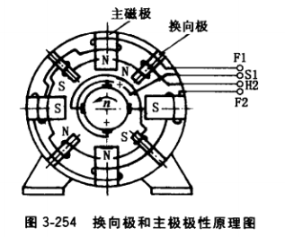 ④在直流勵磁機中,順著電樞方向看,換向極的 極性應(yīng)該和下面一個主磁極(即后切割電樞繞組的磁 極)相同,如圖3-254所示。對此,可用指南針在定子內(nèi)圓周順著電樞旋轉(zhuǎn)方向移動以檢査換向極和主極 剩磁極性、位置,正確時應(yīng)呈N、N, S、S,N、N,S、S,若不符合這順序,應(yīng)對調(diào)主極兩引線在接線盒 的接線位置。
