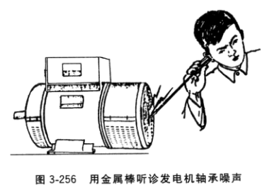 (1)故障現(xiàn)象。滾動軸承由于其可靠性 高、維護方便和承載能力大,而被廣泛應(yīng)用 于小型發(fā)電機,但軸承運轉(zhuǎn)噪聲常成為小型 發(fā)電機的主要哚聲源。軸承噪聲從軸承室傳 出,呈金屬滾動摩擦聲。用金屬棒一端接觸 發(fā)電機軸承蓋,耳朵緊貼金屬棒另一端聽診 (見圖3-256),可清晰地辨認出軸承噪聲。